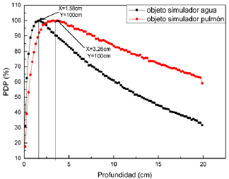 En esta figura se observa que la distribución de dosis en curva de PDP depende de la densidad del material, por ejemplo, para el objeto simulador de agua con densidad de 1,03 g/cm3, se ve que la dosis máxima está a una profundidad de 1,48 cm de la superficie, y para el objeto simulador de pulmón cuya densidad es 0,32 g/cm3, se tiene que la dosis máxima se deposita a 3,26 cm de profundidad.