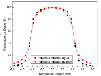 FIGURA 4: Perfil de dosis para objetos simuladores de agua y pulmón en un campo de irradiación de 2x2 cm
