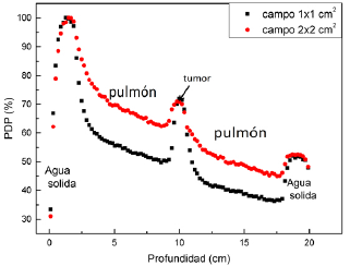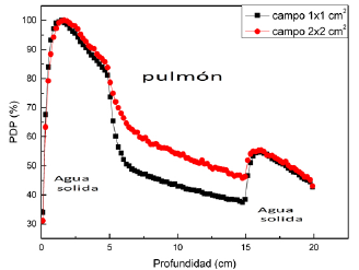 En la figura 3. se muestra la curva de porcentaje de dosis en profundidad (PDP) para los objetos simuladores de agua y pulmón en campo de radiación de 2x2 cm2, usando el mismo haz de fotones de energía nominal de 6 MeV para ambos casos.