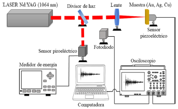 Se describe el procedimiento para determinar el umbral de ablación de diferentes metales (cobre, oro y plata), utilizando la técnica fotoacústica. La figura 1 muestra el esquema experimental empleado para obtener las señales fotoacústicas de cada una de las muestras metálicas irradiadas con pulsos láser. La placa metálica se adhirió a un sensor piezoeléctrico (previamente caracterizado [15]) y fue irradiada por pulsos de un laser Nd:YAG (Brilliant de la marca Quantel) operando en su emisión fundamental (λ=1064 nm). En el camino de la radiación laser se ubicó una lente (distancia focal de 75 mm) para enfocar el haz incidente sobre una superficie pequeña de la placa y así aumentar la fluencia laser sobre ella. La señal resultante fue adquirida por un osciloscopio digital (Tektronix, DPO 3054, 500 MHz, 2.5 GS/s) y los datos exportados a una computadora para su posterior análisis. Se utilizó un fotodiodo como mecanismo de disparo del osciloscopio para que este pueda registrar las señales detectadas por el sensor piezoeléctrico. Para medir la energía de los pulsos del laser incidentes sobre la placa se utilizó un medidor de energía (Newport, 1936-R con detector piroeléctrico 818E-03-12-F); se ubicó un divisor de haz en el camino de la radiación laser y se midió la energía del pulso laser reflejado por el divisor de haz que llega al detector piroeléctrico del medidor de energía y de manera indirecta se obtuvo la medida de la energía del pulso laser que incide sobre la placa metálica.