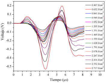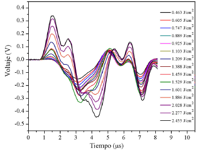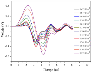 En la figura 2 se presentan las señales fotoacústicas para la muestra de cobre a diferentes fluencias. Se observa un incremento en la intensidad de la señal fotoacústica conforme aumenta la fluencia láser incidente sobre la placa de cobre adherida al sensor. Respecto a la forma de la señal no se observan cambios para fluencias ≤ 1.628 J/cm2 (régimen termoelástico); a partir de 1.791J/cm2 se observan modificaciones en la forma de la señal, lo que indica que la placa de cobre sufre cambios físicos en su superficie (régimen de ablación). Se observa que en el régimen de ablación el tiempo de arribo de la señal fotoacústica al detector piezoeléctrico disminuye con el aumento de la fluencia láser debido a que se esta extrayendo material de la placa de cobre y emerge un primer pico de amplitud positiva no observado en el régimen termoelástico el cual es debido a la onda compresiva que se genera en la muestra por el momento lineal contrario a la dirección del material expulsado desde la superficie de la muestra; concordante con lo reportado por Fotakis y colaboradores [3].