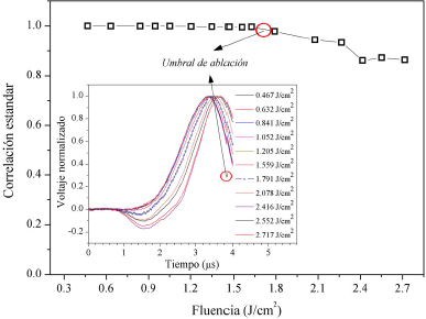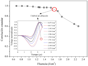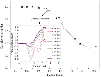 Por lo tanto, la fluencia laser umbral debe estar comprendida entre los valores de fluencia de 1.564 J/cm2 y 1.741 J/cm2, lo que expresado en valor medio nos da (1.65 ± 0.09) J/cm2. En el recuadro de la Figura 6 se grafican algunas de las señales fotoacústicas normalizadas, donde observamos los cambios en la forma de la señal fotoacústica que reporta el análisis de correlación.