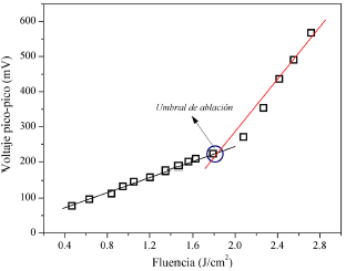 En la figura 4 se muestra el cambio en la amplitud (voltaje pico-pico) de las señales fotoacústicas conforme aumenta la fluencia láser, para la muestra de cobre. Para este análisis se ha reportado que en el régimen termoelástico el incremento de la amplitud fotoacústica es lineal [15] y el umbral de ablación corresponde al valor de la fluencia donde esa linealidad cambia abruptamente [11]. Por lo tanto, de la gráfica podemos observar que el umbral de ablación para la muestra de cobre irradiada con pulsos láser de 1064 nm debe ser próximo a 1.791 J/cm2, dado que en esa región se observa que ocurre un cambio en la pendiente de la curva, correspondiente a cambios físicos observados en la superficie de la muestra de cobre.