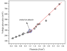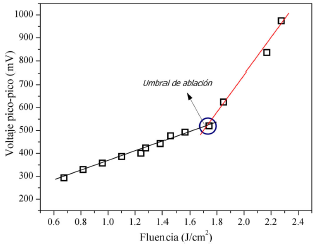 En la figura 10 se muestra el cambio en la amplitud fotoacústica (voltaje pico-pico) de las señales fotoacústicas conforme aumenta la fluencia laser. De la gráfica podemos observar que el umbral de ablación para la muestra de plata irradiada con pulsos laser de 1064 nm debe ser próximo a 1.209 J/cm2, dado que en esa región se observa un cambio en la pendiente de la curva, correspondiente a daños físicos observados en la superficie de la muestra de plata.