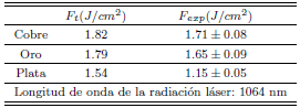 En la Tabla 1, se resumen los valores teóricos y experimentales de las fluencias umbrales obtenidas para el cobre, oro y plata.