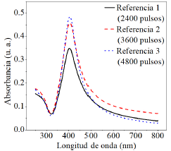 La figura 2 muestra los espectros de absorción de las muestras referencias 1, 2 y 3. Cada espectro presenta un máximo de absorbancia en el intervalo de longitudes de onda correspondiente al espectro electromagnético visible. El máximo de absorbancia es debido al plasmón de superficie de nanopartículas esféricas de plata [6,13,28]. Al comparar los espectros de absorción de la referencia 1 y 2, obtenidos al considerar 2400 y 3600 pulsos del láser para la síntesis, se evidencia mayores valores de absorbancia para la referencia 2, lo cual sugiere mayor concentración. Al comparar la referencia 2 y 3, se evidencia menores valores de absorción para las longitudes de onda próximas al infrarrojo cercano de la referencia 3 en comparación con la referencia 2. Esto sugiere que el aumento del número de pulsos láser para la síntesis desde 3600 hasta 4800, conllevó principalmente a la fragmentación de las nanopartículas, sin cambiar significativamente la cantidad de material extraído desde la superficie del blanco. Se ha reportado que la cantidad de plata extraída desde la superficie de un blanco de plata sumergido en agua incrementa no linealmente con el incremento del número de pulsos láser considerados para la síntesis [29].