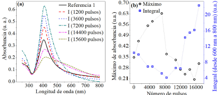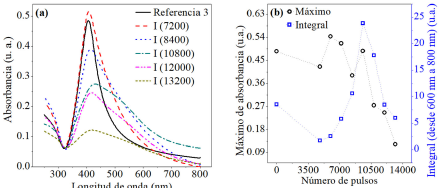 La Figura 5a muestra el espectro de absorción de referencia 2 en función del números de pulsos láser considerados para la post irradiación. La Figura 5b muestra el máximo de absorbancia y la integral del espectro de absorción para las longitudes de onda próximas al infrarrojo cercano (desde 600 nm a 800 nm) en función del número de pulsos láser considerados para la post irradiación a referencia 2. Al aumentar el número de pulsos hasta 6600, el máximo de absorbancia y la posición del pico correspondiente al plasmón de superficie no presentaron una tendencia clara. Sin embargo, la integral disminuyo. La disminución en la integral sugiere disminución en el ancho de la distribución de tamaños. Al aumentar el número de pulsos desde 6600 hasta 21600, el máximo de absorción y la integral mostraron una tendencia a disminuir y a aumentar, respectivamente. Esto sugiere agregación de nanopartículas.