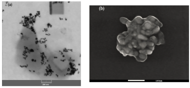 Al considerar el espectro de absorción del coloide post irradiado con 15600 pulsos, se observa un cambio significativo en la forma del espectro. El cambio en la forma del espectro de absorción sugiere la presencia de nanopartículas de plata no esféricas, agregados y aglomerados. La Figura 4 muestra imágenes de referencia 1 antes y después de haber sido expuesto a una post irradiación con 9600 pulsos de láser. En la Figura 4a se observa la presencia de nanopartículas esféricas de plata con diámetros menores a 50 nm. La Figura 4b muestra la presencia de elipsoide y nanoesferas con diámetros entre 20 nm y 38 nm. Se observa coalescencia de las partículas con morfologías esféricas y ovoides con tendencia a formar triángulos con esquinas cortadas.
