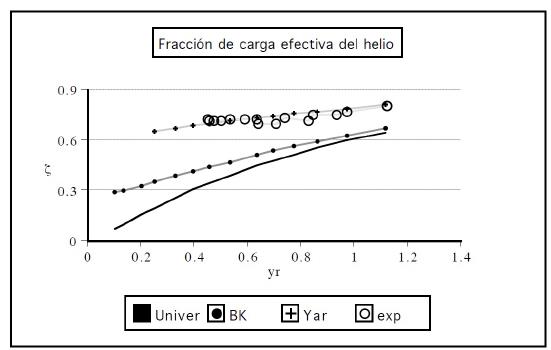 En esencia importan las diferencias entre teoría y experimento, y en este aspecto los cálculos de B-K y Yar discrepan levemente y prácticamente por igual (la primera por defecto y la segunda por exceso) de los valores experimentales para N y Ne (en Ar prácticamente coinciden entre sí). No sorprende el resultado en B-K, por ser los valores experimentales que en su momento sirvieron para comprobar la teoría para Z > 5. Lo notable es que Yar predice además las fracciones del helio (figura 1), logrando así el cometido en el rango completo sin hipótesis distinta a suponer que todos los elementos, incluido el hidrogeno, siguen razonablemente la curva universal de ionización.
