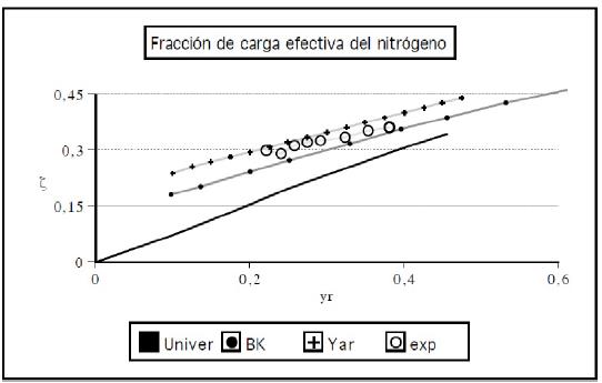 la cual muestra un buen ajuste (desviación < 5 %) en el rango yr < 0, 2; el que corresponde a la data de Schulz para Ar y Ne (en N se subió el límite a yr ≈ 0,3; esperando no exceder las tolerancias y sin mas justificación que la consistencia de los resultados). Se empleó el valor de parámetro b = 1,33 que permite comparar en igualdad de condiciones con Schulz (además en correspondencia con los lineamientos de Brandt de la tabla 1. Para y- > 0, 2 (el rango correspondiente a los y- del hidrógeno) se empleó un ajuste polinomial de grado 5,