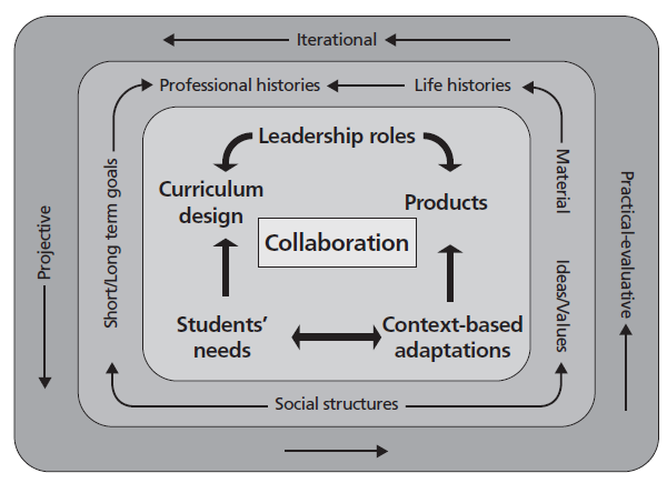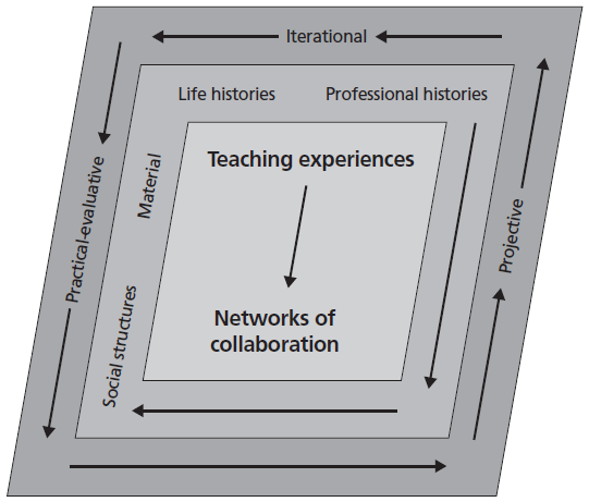 This study takes this ecological notion of teacher agency as the primary construct to address agency theory. We adopted a model of teachers’ agency put forward by Priestley et al. (2015). This model, also known as the Chordal Triad of Agency, describes the development of teacher agency within three dimensions: (a) iterational (past orientations); (b) practical-evaluative (present orientations), and (c) projective (future orientations).