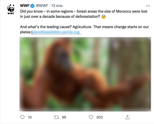 Regarding selection methodology, 100 tweets were manually gathered by taking screenshots from a computer. As my interest was to focus on two specific Twitter accounts in a certain period, I manually selected 50 tweets per account following numerical and chronological criteria. The compilation of tweets started on February 16th, 2022, and the tweets were collected, going backwards in time until the set number was reached. The combination of chronological and numerical criteria catered for the significant difference in publication frequency between both accounts: While the timespan of WWF’s selected tweets goes from January 1st to February 16th, Greenpeace’s only covers from February 11th to February 16th. All tweets were extracted from the section “Tweets and replies,” excluding retweets to focus on Twitter content specifically produced by the accounts.