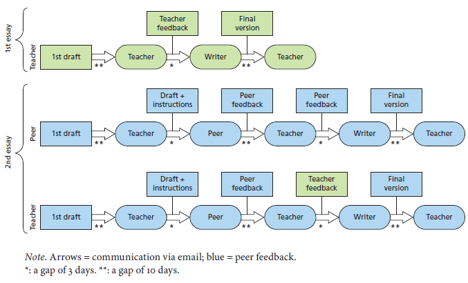 During the ten-day interval, learners had to provide feedback; the teacher randomly chose half of the essays to give feedback himself. After learners emailed the teacher the feedback for their peers’ text, all authorship information was deleted from these files that were emailed back to the writers. All students received their revised text at the same time. Furthermore, they believed they were receiving feedback from a peer, even though half of them had feedback provided by the teacher, a design facilitated by electronic feedback (Ene & Upton, 2018). Finally, learners had three days to consider their feedback and submit their final versions for teacher evaluation.