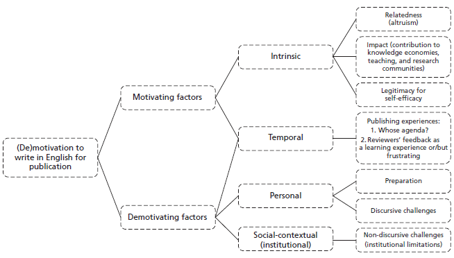In terms of demotivation among EAL scholars, discursive as well as non-discursive challenges exert a negative influence. Regarding discursive factors, the same studies reviewed above demonstrate that EAL scholars’ challenges may be connected to L2 development and preparation, understanding of writing conventions and genres, practices in their L1, and issues at the juncture of discourse and argumentation (Mur-Dueñas, 2019). In this study, we locate discursive challenges at the intersection of intrinsic, social-contextual, and temporal factors since scholars’ frustrations and performance may be connected to self-efficacy, difficult working conditions, and preparation. Discursive challenges may be aggravated when non-discursive issues such as lack of institutional support with ERPP and research, lack of access to (im)material resources (e.g., human, time, space, finances, bibliography, technology), or even national language policies (Rounsaville & Zemliansky, 2020) increase EAL scholars’ frustration with publishing in English-medium journals (Corcoran, 2019; Janssen & Ruecker, 2022; Mendoza et al., 2021). It is worth noting that incentives such as financial rewards, promotions, or international recognition do not necessarily enhance EAL scholars’ motivation to publish in English in the long term. Xu’s (2020b) study with Chinese academics reveals that incentives can demotivate them since they feel their agency and autonomy are threatened, as they need to orient themselves to respond to an institution-mandated research agenda. In López Navarro et al.’s (2015) study, the participants also showed that the pressure of high-ranking journals and institutions to appeal to an international audience to the detriment of local needs acted as a demotivating factor.