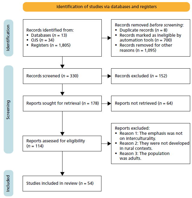 As bilingual educators, recognizing the significance of second language acquisition in teaching and learning, we undertook this review to examine the existing state of interculturality within Latin American rural contexts. We aimed to gain insights into the current landscape and better understand how cultural diversity is addressed in these educational settings. In this manner, we meticulously examined 54 articles, delving into their contents to uncover prevailing trends, identify existing gaps, and gain insights into the ongoing efforts in this field. This exploration gave us a holistic view of the current situation and paved the way for informed analysis and evaluation. Hence, we proposed the following questions formulated before starting this systematic literature review: Is there bilingual education in rural areas? Is bilingual education a concern just for urban areas? Are bilingual education and interculturality in rural contexts interconnected? Are language policies specifically adapted to each country and population?