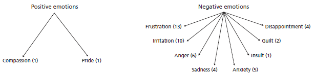 The second finding of the study revealed that the participating teachers had experienced both negative and positive emotions in response to SDB in the classroom. The participants reported having experienced negative emotions such as frustration, sadness, guilt, disappointment, insult, irritation, anger, and anxiety (see Figure 1). Among these, frustration (13), irritation (10), anger (6), anxiety (5), and disappointment (4) were the most frequently mentioned emotions. The following excerpts further support these findings: