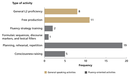 The participants described 46 activities they considered promoted oral fluency. These activities were coded using Tavakoli and Hunter’s (2018) framework, and the results are summarised in Figure 1.