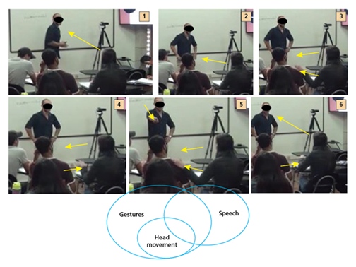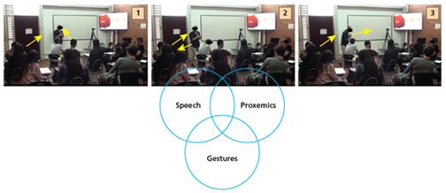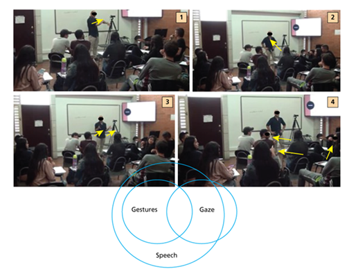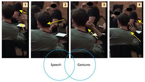 As such, this communicative action was accomplished through many actions deployed through two modes: speech and gestures. Such combinations of modes sought to deliver the same idea, complementing each other and enhancing meaning in interaction.