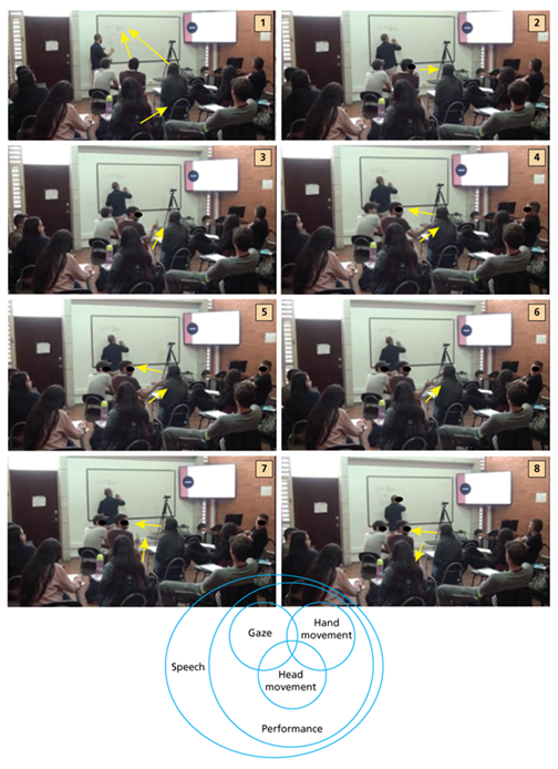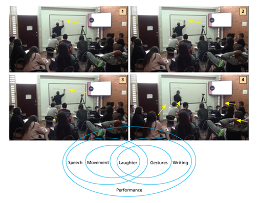 The term “speech acts” may misleadingly suggest that these are predominantly accomplished via the speech mode and its prosodic properties. Multimodality offers an additional opportunity to explicitly desegregate communicative action into the multiplicity of semiotic resources and communicative modes in which meaning is asymmetrically distributed, yet interconnected (Escobar-Alméciga & Brutt-Griffler, 2022). In this view, any given mode may play a central role in meaning-making and in performing and exerting acts of communication in particular situational contexts. In the case of the EMI classroom, the complexity of semiotic resources and communicative modes in interaction was often complementary (see Excerpt 3).