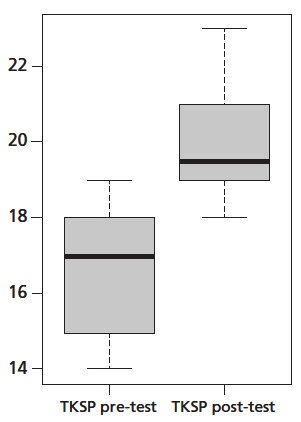 The results indicate statistically significant differences in the TKT scores before and after the PBL intervention (see Table 1 and Figure 1). Specifically, there was a notable average increase of 8.9 points (p < 0.05), with a 95% CI [4.628, 13.172]. This represents an 11.1% increase relative to the maximum score.