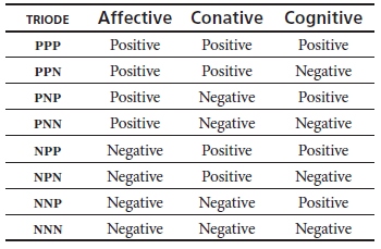 From Schiffman and Kanuk’s model, Jain (2014) proposes a tridimensional analysis of attitudes based on the different possible combinations of the cognitive, the affective, and the conative components. By the interaction of these three components, an attitude is developed toward an object. Given that each component can be positive or negative, the possible combinations are eight. Table 1 presents this triode distribution.