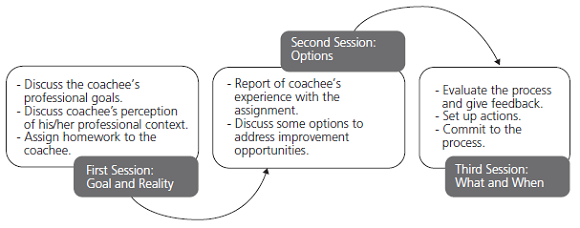 Whitmore (2009) states that “coaching is unlocking people’s potential to maximize their own performance” (p. 10). He promotes the GROW model (Goal, Reality, Options, and What and When) as the model coaches should follow during a coaching session. The International Coaching Leadership in Colombia (2011) defines the GROW model as Goals, Reality, Options, What and Will. In the Goal stage, coachees set short and long term goals. To examine the Reality, it is indispensable to explore the situation at the present time. Options refer to the different possibilities the coachee has and the strategies that he or she can use. What involves the actions, the performers, the commitment, and the will to achieve what has been set.