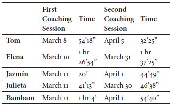 We included the coaching sessions as “new and creative data collection methods” (Creswell, 2007, p. 129). The coaching sessions are private, confidential, and target-oriented conversations between a coach and a coachee (Goldvarg & Perel de Goldvarg, 2011, p. 261). They can last between 90 and 120 minutes (Cubeiro, 2011, p. 27). The coaching sessions performed in our project lasted from 20 minutes to around 2 hours as Table 1 shows.