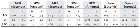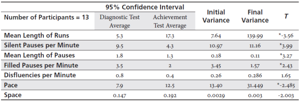 Table 1 shows the favorable outcomes (FO), the average (a), and the less favorable outcomes (LFO). These correspond to the seven different criteria and contrast the scores students obtained in both the diagnostic (D) and achievement (A) tests. The average scores show participants increased their scores in the MLR by more than 150%, and they also reduced their SPM by more than 50%. The other scores revealed less than 50% of improvement. The scores of the MLP clearly depict a slight improvement of 0.5; however, the overall results show that there were 50% less pauses per minute and these pauses were slightly shorter than the scores of the diagnostic test.