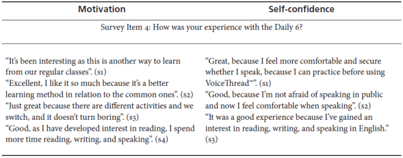 As to the qualitative data, in first place emerged affective factors such as self-confidence and motivation, which were crucial for the amelioration of oral fluency among students through their enhanced participation in the Daily 6. Although the ultimate goal of the study did not focus on affective factors, it was inevitable to witness evidence of self-confidence and motivation among the participants. Table 3 displays evidence retrieved from the surveys (see Appendix).