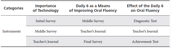 Subsequently, the qualitative data collected from various sources (see Table 4) resulted in three main categories: Importance of Technology for the Speaking Skill, Daily 6 as a Means of Improving Oral Fluency, and Effect of Daily 6 on Oral Fluency. These categories emerged after a continuous contrast of information and after following Creswell’s (2012) method of “generating and connecting categories by comparing incidents in the data to other incidents, incidents to categories, and categories to other categories” (p. 434).