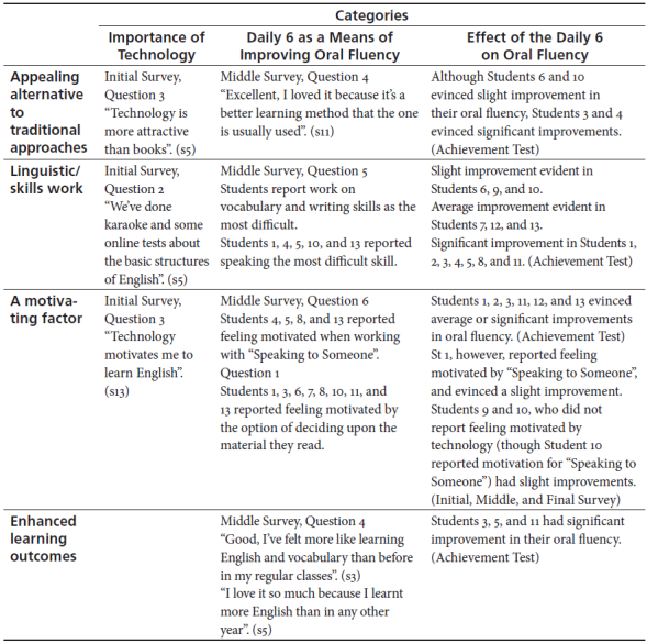 Through instruments like the middle survey and the teacher’s journal, we gathered enough evidence to support the Daily 6 as an innovative and efficient approach to improve oral fluency. Some students even reported greater success in the current English lessons compared to other school years. After data triangulation, it was evinced that greater improvement came to those students with a positive attitude towards technology use and active class participation with the Daily 6. Moreover, as seen in Table 5, students who reported an increase in motivation to study English with the Daily 6 succeeded with superior scores in the achievement test for speaking.