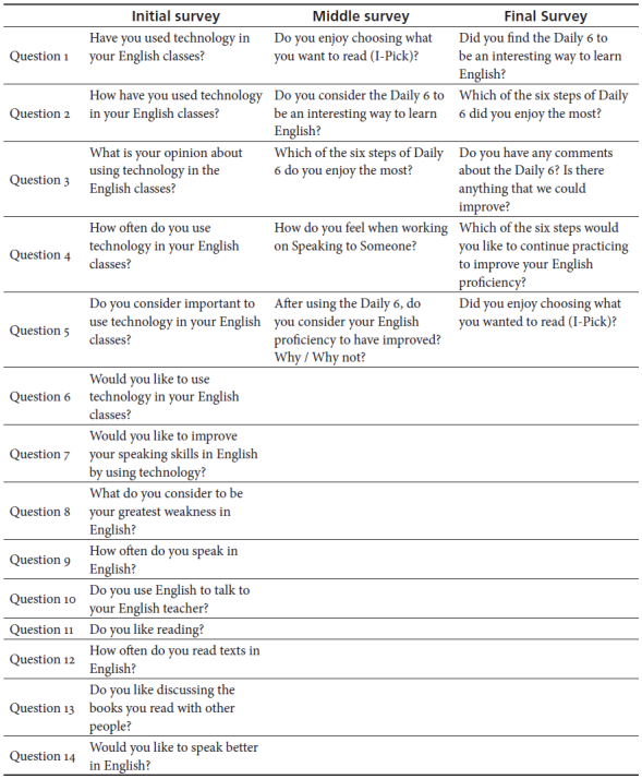 For validity and reliability, we adhered to triangulation, peer-review, and piloting of the instruments as discussed in Johnson (1997) and Newman and Benz (1998). Likewise, researchers applied a trial of every single instrument in a classroom with similar conditions to the one implementing the Daily 6, testing a small-scale trial as described by Sapsford and Jupp (2006). In addition, interviews were aligned to the speaking section, part 1, of the international test formats KET/PET (University of Cambridge, 2010).