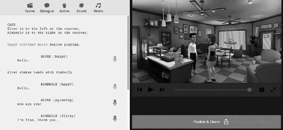 Plotagon is a very intuitive content creation software (https://plotagon.com/) that can be used in education due to its text-based movie creation interface, as a storytelling tool for creating short or longer films. Plotagon has been an educational app that allows students to create instant animated videos. Students can create their own characters, choose scenes, write dialogs, and add emotions, sound effects, and actions. This software offers a free trial option for individual storytellers, a licensed version for students and educators, and another one for designers and professional users (Plotagon Education, n.d.).