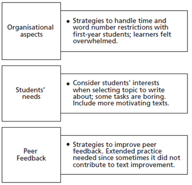 First, students referred to organisational aspects like time and word number limitations; they highlighted being under pressure trying to fulfil the external demands when writing.