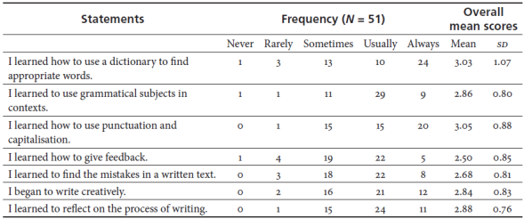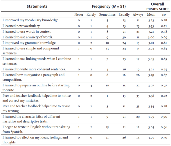 The main quantitative findings are summarised in Table 2; it can be observed that 15 out of 22 items (68.1%) had a highly positive appraisal by learners. Participants reported that keeping a writing portfolio in an IELTE programme contributes considerably to vocabulary knowledge in 44 out of 51 students (M = 3.23, SD = 0.78), especially learning new vocabulary, where 46 students out of 51 indicated they had acquired new words (M = 3.33, SD = 0.71) and using it in context. Additionally, learners indicated they improved their grammar knowledge in general, they learned to use linking words to combine sentences; 42 students indicated they usually or always learned how to do this (M = 3.09, SD = 0.85), to use simple and compound sentences (37 students chose usually or always), and to use grammar in context (39 students had positive perceptions). Moreover, learners considered this pedagogical strategy had an impact on their writing skills; namely, how to organise a paragraph in a composition (M = 3.29, SD = 0.87) and to a lesser extent, to develop pre-writing activities, mainly outlining with 37 students appraising this writing stage (M = 3.07, SD = 0.97).
