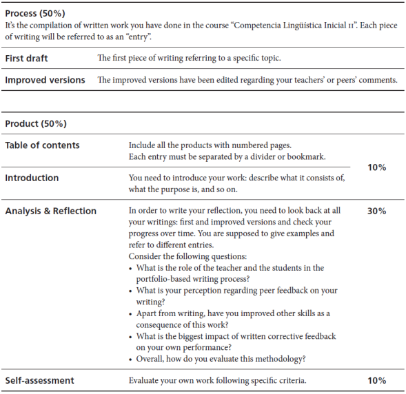 Self-assessment: At the end of the semester, students need to evaluate their writing skills process regarding language development, vocabulary usage, and time organisation, among other specific criteria.