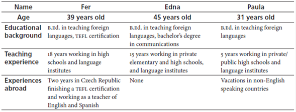 This study involved three Colombian in-service EFL teachers working at a binational language center. Selection of the participants followed a convenience sampling without inclusion criteria identified prior to the selection of subjects. Pseudonyms were used in order to preserve the participants’ anonymity.