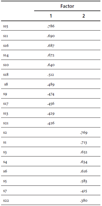 Items 12, 20, and 19 were excluded from the analysis since they failed to lean toward any of the two factors. The first factor explained 35.032% of the variance of the model and considered items 8, 9, 10, 11, 13, 14, 15, 16, 17, 18, and 21. By content, these items referred to the use of Spanish with pedagogical-didactic purposes. The second factor grouped items 1, 2, 3, 4, 5, 6, 7, and 22 and explained 6.25% of the variance. This factor referred to the use of Spanish to maintain the student-teacher relationship.