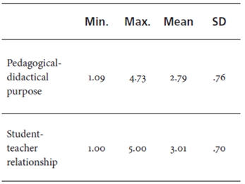 As shown in Table 2, the means are similar, in rather central values of the scale. However, the average of the use dimension for the student-teacher relationship is slightly higher.