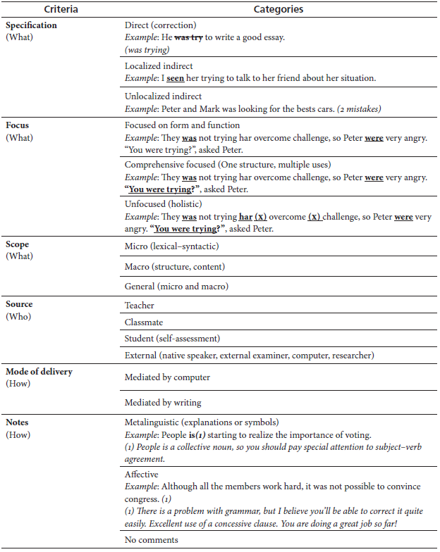 Although several investigations have been carried out in recent years on written corrective feedback (WCF), there is a lack of agreement about its definition and the effect on students’ writings of different types of feedback. This may be due to the lack of systematicity regarding the characterization of WCF used in those studies. This article seeks to review the concept of WCF in studies in the field and to systematize the various aspects considered in a typology, which includes specification, focus, scope, source, mode of delivery, and notes. The resulting typology should help improve the effectiveness in the comparison of WCF studies and serve as a reference for teachers interested in expanding their practices.