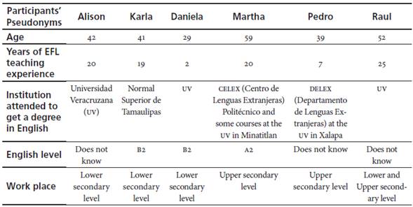 Six EFL teachers working in lower secondary and upper secondary public schools were the participants. Three of them have a degree in English from the main public university in the state of Veracruz, Mexico. The other three studied in different institutions such as Escuelas Normales but have also taken courses in the State University. Their ages range from 29 to 59 years old and they have between 2 and 25 years of teaching experience (see Table 1).
