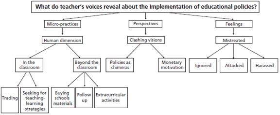 After immersing ourselves in the voices of elementary school teachers, and as an answer to our research question, we found that teachers take actions-which we have called micro-practices-have their own perspectives about policies, and feel negatively treated by the national government. In Figure 1 we illustrate these categories and their subcategories.