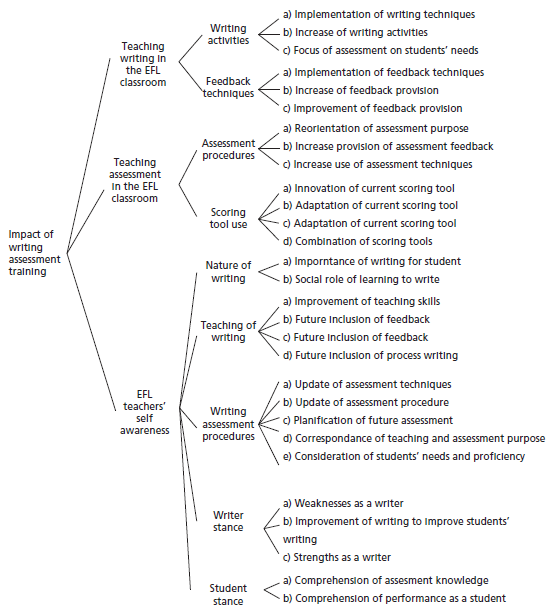 The WATIC is a multi-level assessment impact construct compiled from the themes, subthemes, and categories that emerged from the data. The first level includes the three major areas of impact: Writing in the EFL Classroom, Classroom Assessment of EFL Writing, and Teacher Self-Awareness (Level 1). Each subtheme represents the actions that TPs reported and that represented, in the TPs’ perception and my own, the effect of training in their writing assessment practice. Each subtheme portrays from two to five categories (Level 3).