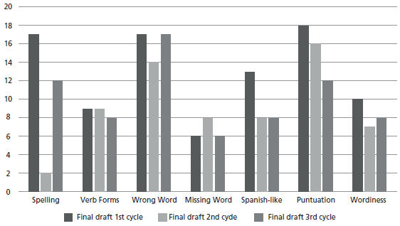 At the beginning of the process, several elements related to language mechanics mistakes were evidenced. Regarding the production from the first cycle of the implementation (a draft and final paper) through indirect written feedback, we noticed a high frequency of mistakes in terms of punctuation, wrong word, spelling, Spanish-like forms and wordiness, and a not so frequent display of mistakes related to verb forms and missing word (see Figure 3).