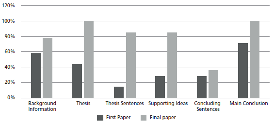 At the beginning of the semester, the abovementioned aspects were in need of improvement. In the first essay students wrote, only 14% of them included topic sentences in the body paragraphs and only 28% wrote supporting ideas and paragraph conclusions. Seventy-two percent of the participants failed to include thesis statements and 47% omitted proper background information in the introductions. However, 71% of the students were able to conclude the essay despite the missing elements mentioned above. We understood these first challenges as the beginning of an ongoing process, since writing practice is a procedure that involves continual and constructive feedback on written work (Bitchener, 2008).