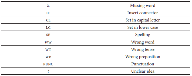 The implementation of the pedagogical cycle in this study required students’ essay drafting to foster their academic writing. There were two drafts per each of the three cycles that were carried out. Once students submitted their drafts, the teacher provided indirect feedback by using proofreading marks (see Appendix) that were established and socialized at the beginning of the semester. Based on the correction of these texts and the systematization of proofreading marks from the final drafts, it was possible to identify the types of mistakes that were frequent in terms of language mechanics and essay particularities.