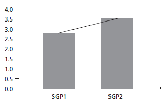 The evaluation of SGP1 and SPG2 revealed differences in the levels of comprehensibility (Isaacs et al., 2017) of the average across the 18 participants in the study, as reported by each of the four evaluators. NES, NEST1, and EXP rated SGP1 as reasonable comprehensible while NNEST2 rated it as basically incomprehensible. NES rated SGP1 as reasonably comprehensible (RC+) with the highest score (3.5) in contrast with NNEST 2 who rated it as basically incomprehensible (BI+) with the lowest score (2.5). NNEST1 and EXP coincided in rating SGP1 as reasonably comprehensible (RC-). In SGP2, NES, NNEST1, and NNEST2 reported a slight gain in comprehensibility (0.5) when contrasting scores with SGP1 while EXP reported a more significant gain (1.0). NES and EXP coincided in rating SGP1 as largely comprehensible (LC-). NNEST2 reported that SGP2 barely achieved a reasonably comprehensible (RC-) level. None of the evaluators scored SGP2 as fully comprehensible (FC- or FC+). NES rated both podcasts with some level of comprehensibility, SGP1 as reasonably comprehensible (RC+) and SGP2 as largely comprehensible (LC-); he perceived a slight gain in comprehensibility between SGP1 and SGP2 (0.5). Evaluations of SGPs (Figure 3), contrasting the means of evaluators’ grades in SGP1 (M = 2.83) and SGP2 (M = 3.54), reveal an overall gain in comprehensibility of 0.71 units. Thus, SGP1s were rated as basically comprehensible, while SGP2s were evaluated as reasonably comprehensible.