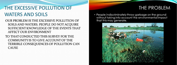 Students read another cause-effect text and answer some comprehension questions regarding the problem, the cause, and the effects. In groups of four, students think of a problem in their community. They design a presentation using slides to show the problem, causes, and consequences (pictures needed).