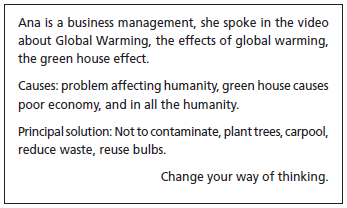 In groups of three, students write a short paragraph about a video message based on what they know or on notes taken.