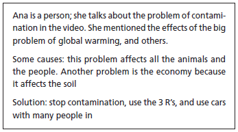Students share what they write while the teacher writes key words on the board. Later, she induces students to notice three things: 1. The problem 2. The causes and the effects 3. The possible solutions